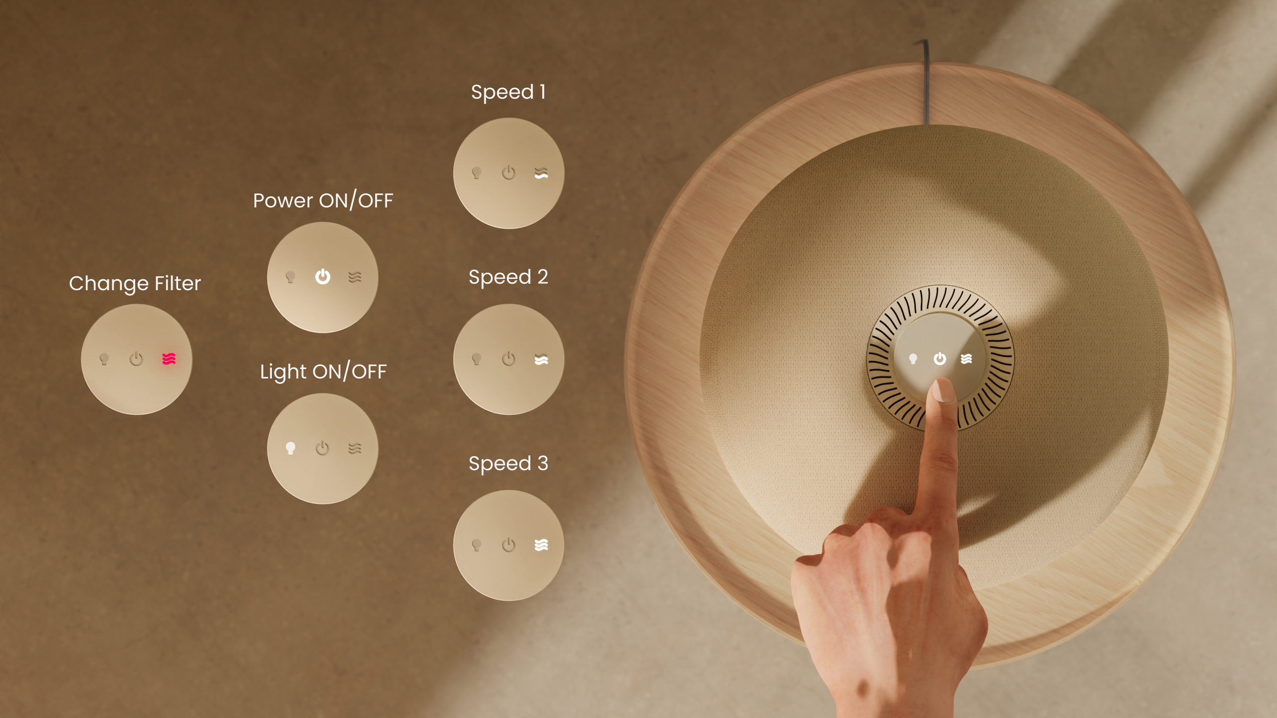 Pura is controlled from the top panel. The LED lights provide easy to understand controls to adjust speeds, lights, power on/off, and when to change the filter.